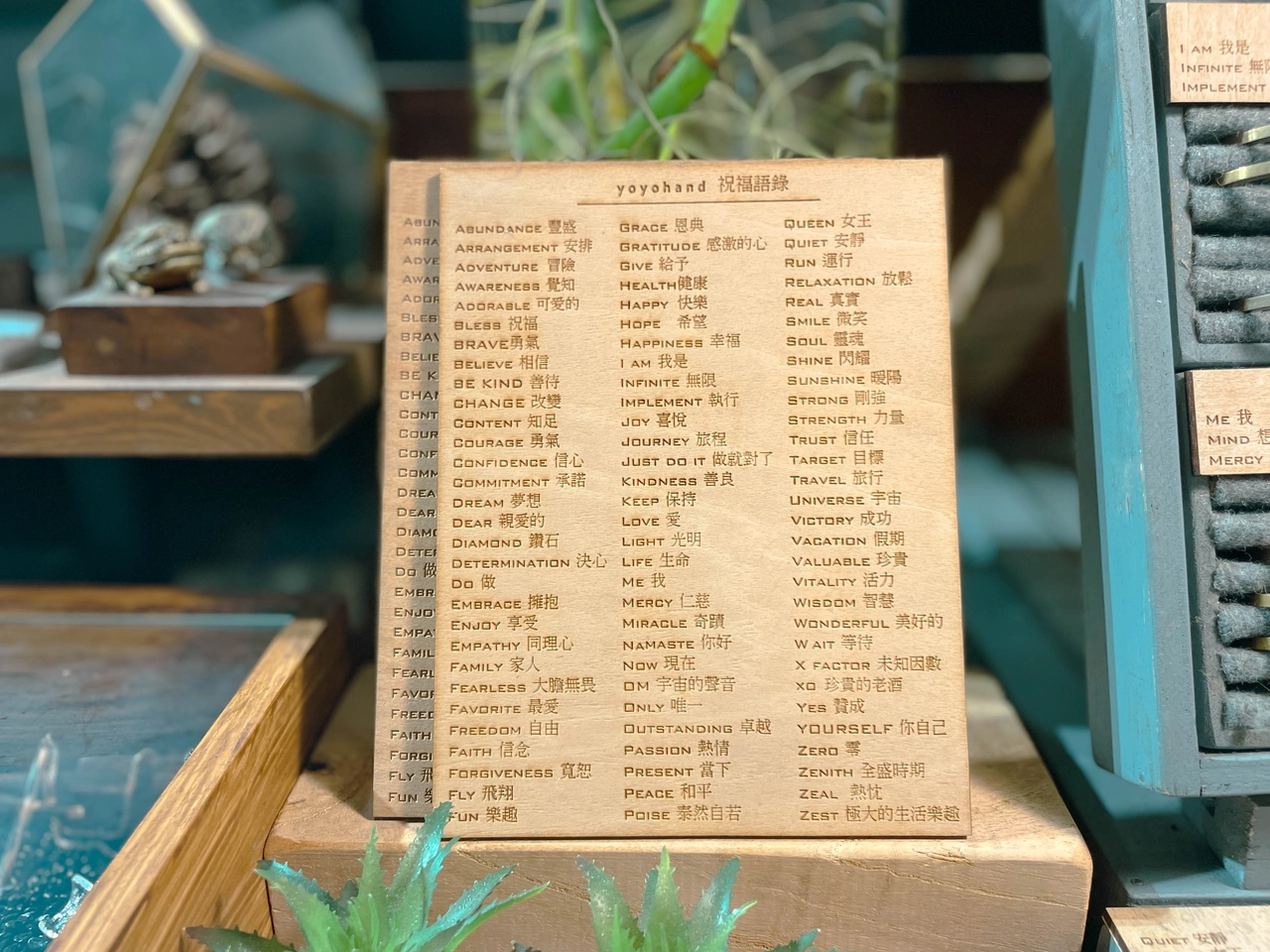 - 店家特製祝福語木板(如圖),將飽含祝福的單字敲進手環內,賦予手環更深的含意。